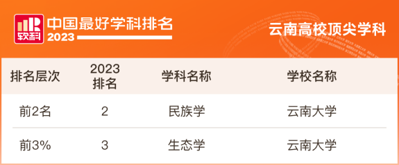 在中国顶尖学科数上,云南省共上榜有2个中国顶尖学科,一是云南大学的民族学,位列全国第2名;二是云南大学的生态学,位列全国第3名。