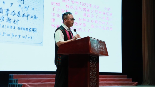 民族团结誓词碑盟誓代表罗恒富的后代罗宗成带来了“后人的心声——把誓言种在大地,开出绚烂之花”的宣讲,他分享了爷爷的誓言之路、父辈的北京之行以及自己在阅兵场上的感悟,深情阐述了回信带来的力量,让现场观众感受到了民族团结精神在家族传承中的强大动力。
