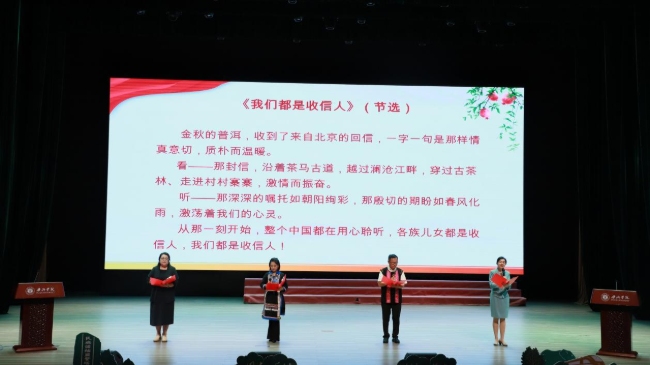 9月23日上午,张桂梅思政大讲堂——普洱学院分课堂、普洱市分课堂2025年第3讲在普洱学院致远楼演播厅举行。本次活动以“重温回信精神 共绘团结新篇”为主题,通过巡回宣讲团成员的精彩报告,带领现场观众重温了普洱民族团结誓词碑的光辉历史,深刻解读了习近平总书记重要回信的精神内涵。