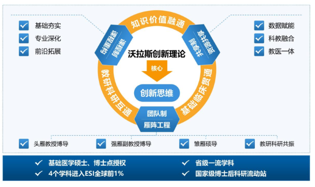 该成果的“课程制”通过课程扩容、内容优化、方法创新、思政融合与评价改革,形成了学科基础课程、专业核心课程、前沿与科研设计课程的3阶递进课程体系,培养强化了研究生创新思维。该成果通过全校省级实验教学示范中心、基础临床科研平台、重点实验室、大赛平台、人体科学馆等资源的“共享制”,打造了“数智赋能、科教融合、教医一体”的育人新模式,培养研究生创新实践能力。该成果的“团队制”秉承“导师是研究生创新能力培养第一责任人”的理念,开创了“雁阵工程”的头雁(教授博导)—强雁(副教授博导)—雏雁(硕导)传帮带机制,实现了教研科研同频共振团队建设新范式,持续赋能于研究生创新思维和实践能力培养。“创新引领·学科驱动‘一核三制三通’基础医学硕士研究生教培体系构建与实践”成果有效解决了医科院校基础医学硕士研究生培养中创新思维欠缺、科教医协同不足、导师团队的原创能力弱等痛点,显著提升了研究生创新能力和培养质量,强化了导师队伍建设,有力支撑了学科发展。