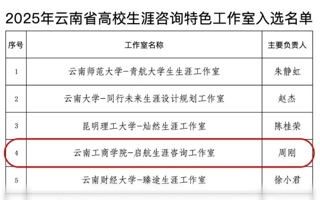 近日,云南省教育厅公布了2025年高校就业创业指导金课和生涯咨询特色工作室名单。云南工商学院“启航生涯咨询工作室”凭借完善的体系建设、专业的师资力量和突出的育人成效成功入选,标志着该校在生涯教育与就业指导方面获得认可。