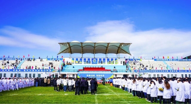 伴随激昂的乐曲,15个方队昂首入场。整齐划一的步伐、昂扬奋进的精神,展示出云中学子的自信与风采。其中,中药学院以舞蹈《万疆》寄托家国情怀,展现中医药文化的时代风采;第一临床医学院方阵手捧《黄帝内经》等典籍模型,象征中医药千年智慧的薪火相传;第二临床医学院方阵高举“医路针先、未来康你”标语,传递医者仁心与青春担当。