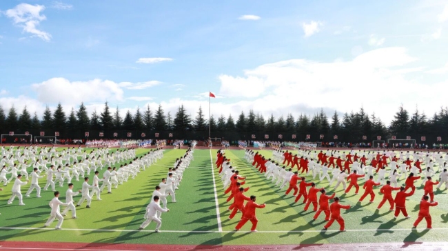 开幕式上,裁判员代表、运动员代表庄严宣誓,表达了公正裁决与奋勇争先的信念。随后,太极拳、啦啦操等团体表演精彩上演,动作整齐、气势恢宏,将中华传统养生文化与青春动感完美融合,赢得现场阵阵掌声。