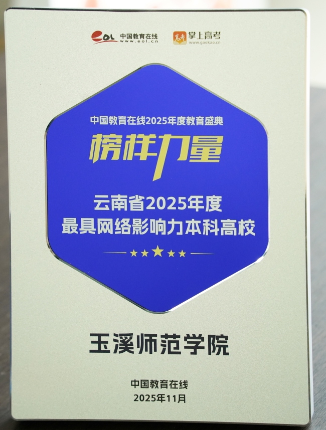 近日,中国教育在线“榜样力量·2025年度教育盛典”优秀案例名单公布。玉溪师范学院凭借在招生宣传和网络传播领域的创新实践和成效,获评“云南省2025年度最具网络影响力本科高校”称号。