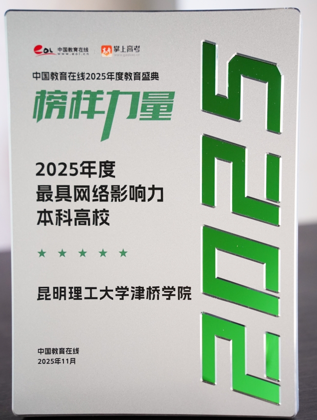 近日,中国教育在线“榜样力量·2025年度教育盛典”优秀案例名单公布。昆明理工大学津桥学院凭借在招生宣传和网络传播领域的创新实践和成效,获评“2025年度最具网络影响力本科高校”称号。