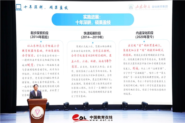 大会主旨报告环节,华中师范大学第一附属中学、重庆南开两江中学、复旦大学附属中学、山东师范大学基础教育集团等五所学校代表,围绕“双教协同”、系统优化与组织创新、乡村教育振兴新范式等主题,分享了各自学校在基础教育优质均衡发展中的实践经验和创新举措。