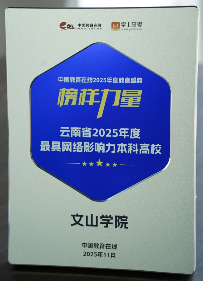 近日,中国教育在线“榜样力量·2025年度教育盛典”优秀案例名单公布。文山学院凭借极具创新性与前瞻性的招生宣传策略,以及扎实过硬的宣传执行实力,从众多高校中突围,获评“云南省2025年度最具网络影响力本科高校”。