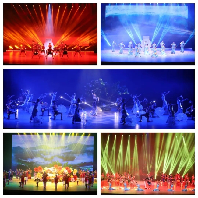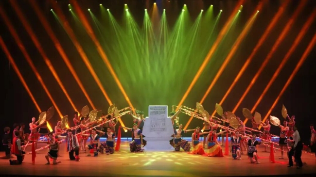 第四幕《宾弄赛嗨》展现各族群众的温暖守望。“宾弄赛嗨”意为“没有血缘关系的亲戚”,剧中懒汉在乡亲们的帮扶下摘掉贫困帽,丰收时节各族儿女围坐粮堆载歌载舞,指尖沾着饱满谷粒,脸上漾着喜悦笑容,彰显了民族团结的强大力量。