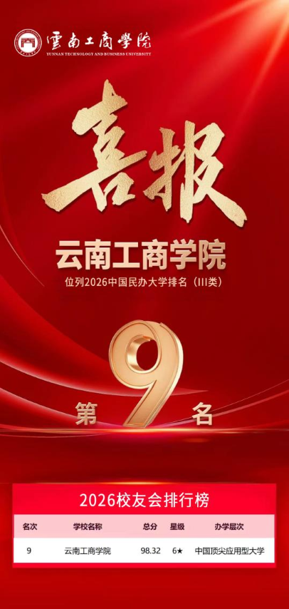 1月12日,全国第三方大学评价机构艾瑞深校友会网(Cuaa.net)正式发布《2026中国大学排名》,云南工商学院以98.32分位列中国民办大学排名(Ⅲ类)第9名,被评定为6星级中国顶尖应用型大学,稳居全国同类高校第一方阵。