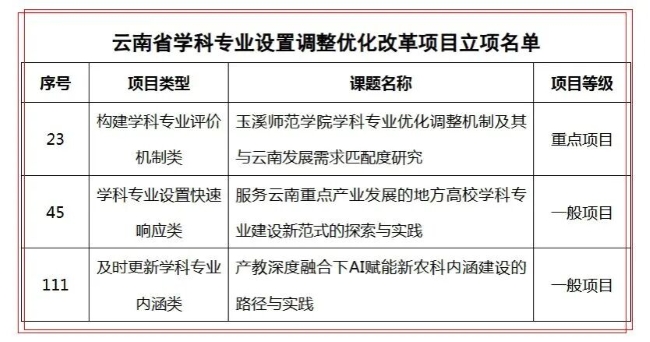 云南省教育厅发布《云南省学科专业设置调整优化改革项目立项名单》,学校3个项目成功获批立项:“构建学科专业评价机制类”重点项目《玉溪师范学院学科专业优化调整机制及其与云南发展需求匹配度研究》、“学科专业设置快速响应类”一般项目《服务云南重点产业发展的地方高校学科专业建设新范式的探索与实践》、“及时更新学科专业内涵类”一般项目《产教深度融合下AI赋能新农科内涵建设的路径与实践》。项目建设将为学校研究生教育改革提供可复制、可推广的示范样板。