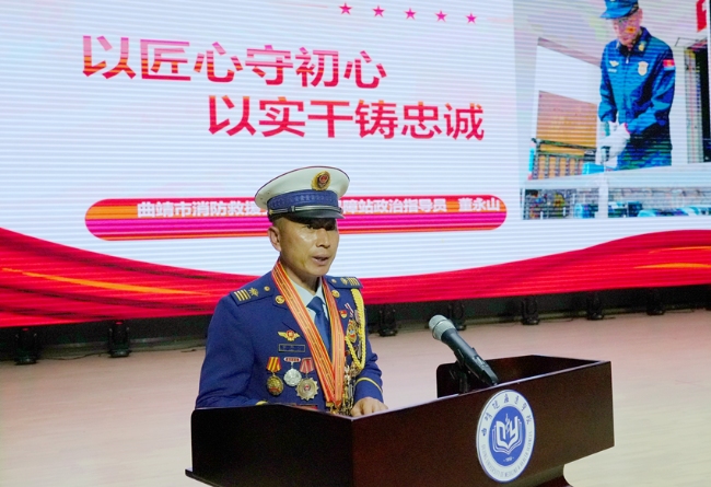 云南省消防救援总队曲靖支队紫云路特勤站“永山班”班长董永山,以《以匠心守初心以实干铸忠诚》为题,回顾了30年来从曾经的一个懵懂少年,一步步成长为中国消防救援队伍的骨干、灭火救援的“尖兵”的心路历程,讲述了一件件鲜活的、发生在他身边的救援经历和消防队伍从“橄榄绿”到“火焰蓝”的时代变革。他勉励曲医学子要立足岗位,干一行、爱一行,专一行、精一行,践行工匠精神,培养创新精神,在平凡中做好点滴工作。