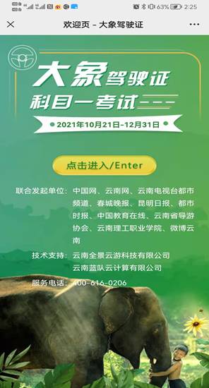 据介绍,“大象驾驶证科目一考试”活动由中国网、中国教育在线、云南网、云视网、吉祥网、云南广播电视台都市频道、春城晚报、开屏新闻、昆明日报、都市时报、微博云南、春城头条、丽江读本、云南省导游协会、云南理工职业学院等多家单位联合发起,由云南全景云游科技有限公司和云南蓝队云计算有限公司全程提供技术支持。