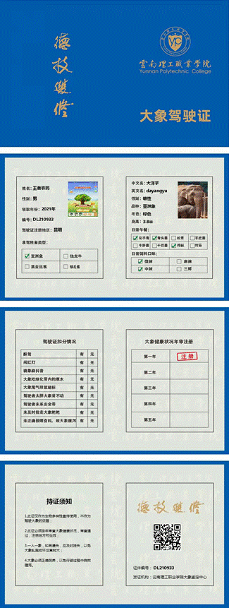 云南理工职业学院“大象驾驶证”策划设计者何家伟表示:“大象驾驶证不是每个人都有,要通过考试,50道题100分,60分及格,才能获取。不只是针对学校的学生,全社会都可以参与。”