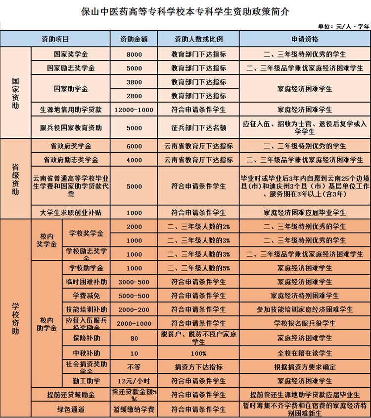 学校设有专门的学生资助工作管理机构——学生资助管理中心。以“精准资助,资助育人”为根本任务,构建了廉(廉洁从事)、奖(奖学金和励志奖学金)、助(助学金)、贷(助学贷款)、勤(勤工助学)、减(学费减免)、免(免学费)、补(困难补助)、通(绿色通道)、育(资助育人)十位一体的发展型资助育人工作体系,着力培养家庭经济困难学生成为新时代社会主义大健康事业建设的有用之才。