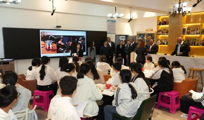 在酒店管理学院,依次参观了咖啡双创教室、茶艺审评教室,并现场观摩饮品制作课程,对课程体系与地方产业紧密结合、注重学生实践能力培养等方面表示高度认可。交流过程中,双方就文旅人才培养、餐饮文化合作等主题进行了非正式会谈。