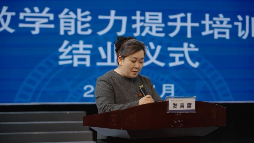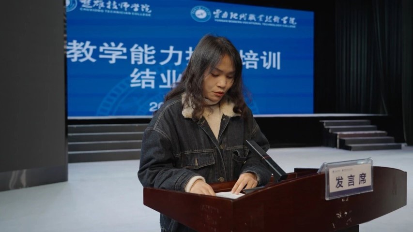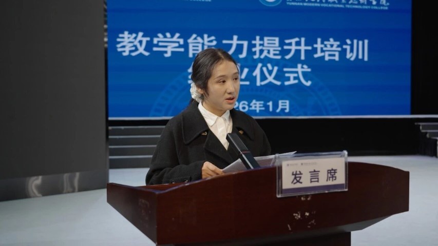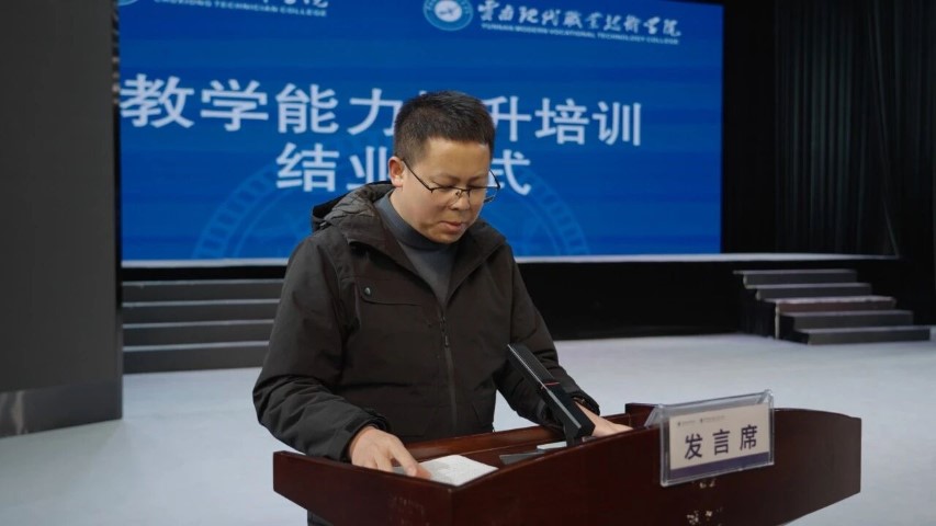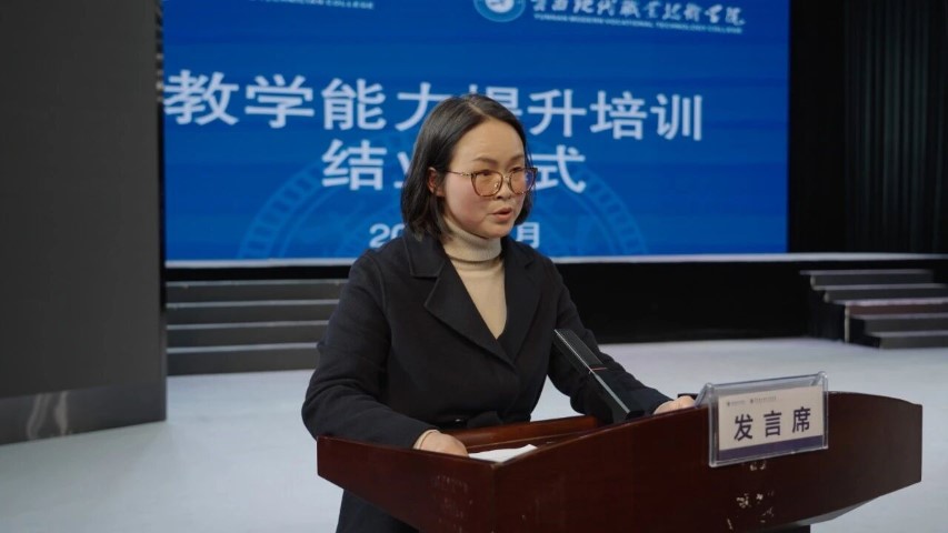 1月16日,培训侧重成果转化与教学融合。各二级学院教研室组织开展期末教研活动,教师们结合培训所学,围绕课程优化、资源建设等主题展开深度研讨,推动培训内容与教学实际紧密结合。下午4时,培训班结业仪式顺利举行,学院党委委员、党委组织部部长杨爱平主持仪式,5位教师代表依次上台分享培训收获与教学应用规划。杨爱平充分肯定了本次培训的成效,并向全体教师提出要求,要将所学技能转化为教学创新的实际成效,深化AI与课堂教学的深度融合,为学院教育教学质量的持续提升注入新动能。