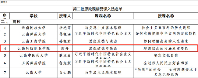 近日,中共云南省委教育工委公布第二批云南省大中小学思想政治教育一体化建设项目入选名单,云南轻纺职业学院陶丹老师入选思政课精品课项目名单。