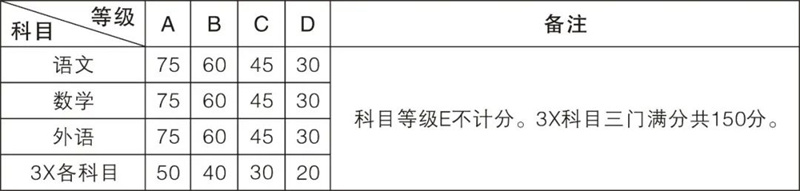 学业水平考试成绩由语文、数学、外语三门中任选两门最优等级科目及3X科目共五门科目成绩组成。3X科目是指除语文、数学、外语外,另7门学业水平考试科目中任选三门最优等级科目。往届生的技术科目成绩由通用技术和信息技术两科成绩中选最优科目等级计入总分。具体成绩折算方法如下: