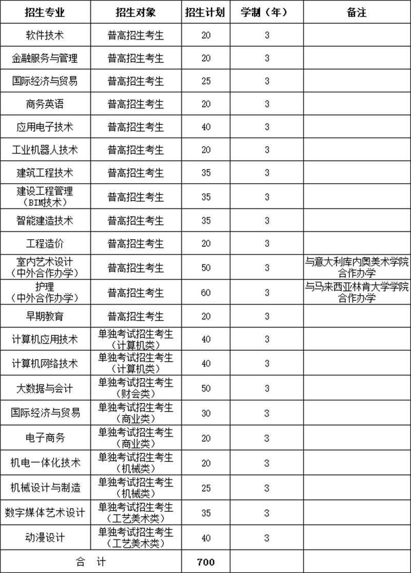 第五条 经浙江省招生主管部门批准,我校2026年面向浙江省高职提前招生计划700名,招收普高招生考生和单独考试招生考生,具体招生计划如下: