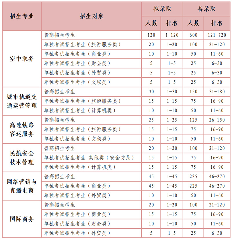 空中乘务、城市轨道交通运营管理、高速铁路客运服务专业的考生在综合测评体检(初检)合格的前提下,学校按综合成绩总分和各类别招生计划,分“拟录取”、“备录取”和“未录取”确定各考生录取情况。进入“拟录取”和“备录取”的考生必须是体检合格且完成该专业综合面试项目。