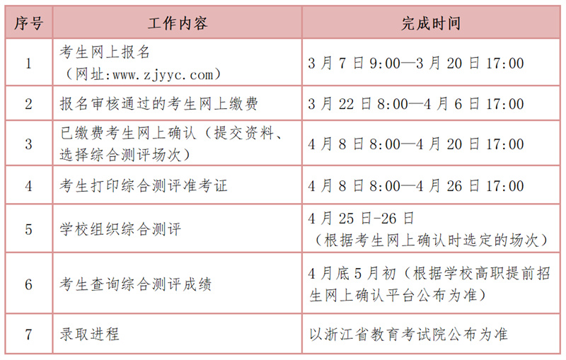 第八条 报考办法:2026年3月7日9:00—3月20日17:00,考生登录浙江育英职业技术学院网站(www.zjyyc.com),进入报名系统(省平台)进行网上报名。报名审核通过(即入围)的考生可根据确认系统(校平台)提示,3月22日8:00—4月6日17:00进行网上缴费。报名考试费,140元/位。空中乘务、城市轨道交通运营管理、高速铁路客运服务专业体检费15元另行收取。4月8日8:00-4月20日17:00进行网上确认(提交资料、选择综合测评场次)。