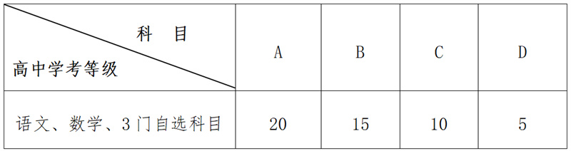 考生普通高中学业水平考试(学考)折算成绩由2门必选科目+3门自选科目组成,五门科目成绩进行折算,不同等级换算成相应分值,满分为100分。必选科目为语文、数学,三门自选科目从外语、物理、技术、政治、历史、地理、化学、生物学中选择学考等级最优的三门。高中学考等级以浙江省教育考试院提供的成绩为准,学考等级是外省获得的,须提供学籍所在省的省级机构出具或签署意见的学业水平考试成绩证书或证明(原件)。换算如下表: