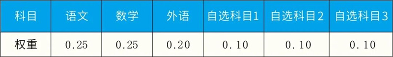 学考成绩由语文、数学、外语和3门自选科目组成。自选科目由学校从学生技术、政治、历史、地理、物理、化学、生物学中选择成绩最优的三门,从高分到低分依次为自选科目1、自选科目2、自选科目3。按下表将每门课程的等级转换为相应的分值,再乘以相应的权重得出最终分数,满分为100分。