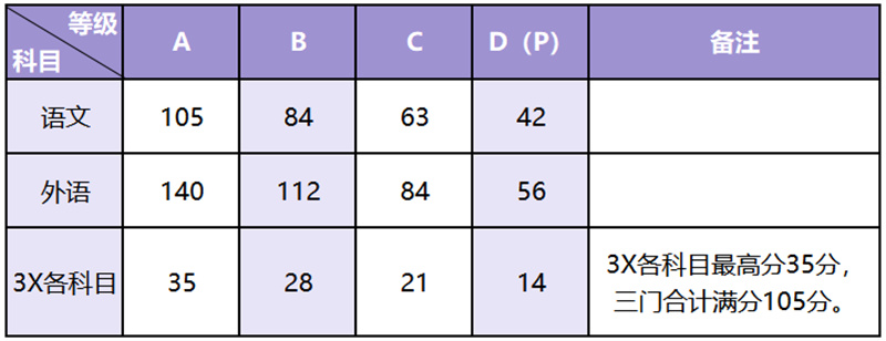 学业水平考试成绩由语文、外语、3X科目五门科目成绩组成,五门科目成绩均需为合格成绩。3X科目是在除语文、外语之外学业水平考试科目中选择的三门最优等级科目,学校认可往届生相应科目的成绩等级(高中学考),其中对通用技术和信息技术两项合并取高的等级作为技术科目学考等级成绩。具体成绩折算方法如下: