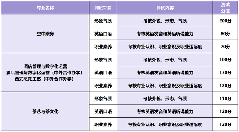 其他专业:分两个考场,一个为英语考场,考核英语发音及英语听说能力;一个为职业素养考场,对形象气质、职业素养等方面具体打分。考生单独进入考场,每人每个考场考试时间约3分钟。