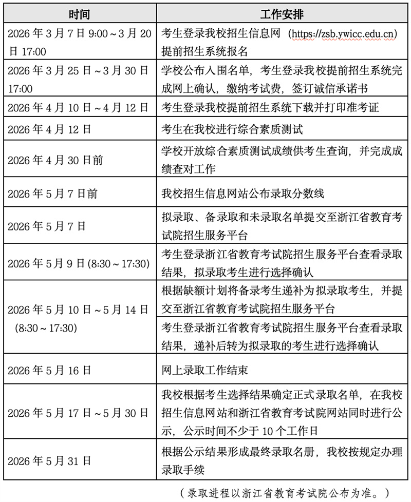 凡符合我校高职提前招生报考条件的考生,于2026年3月7日9:00至3月20日17:00间登录我校招生信息网(https://zsb.ywicc.edu.cn)提前招生系统进行报名。允许每个考生填报3个专业志愿和服从专业调剂志愿。