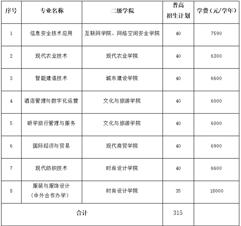 第十三条 经浙江省教育考试院批准,学校2026年面向浙江省高职提前招生专业共8个,招生计划315名,均面向普高招生,具体以浙江省招生部门公布为准,详见表1。