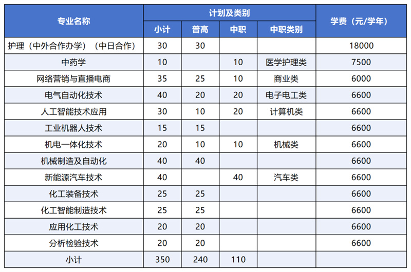 学校2026年高职提前招生总计划350名,其中普高招生考生计划240名,单独考试招生考生计划110名,具体招生的专业、计划、类别、学费如下表所示: