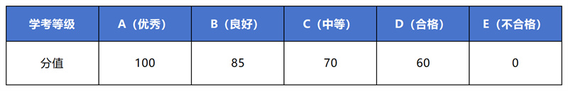 按照考生高中学业水平考试(学考)成绩,即语文、数学、外语、政治、历史、地理、物理、化学、生物学、技术10门课程,从高分到低分依次取前5门学考成绩作为测算目标(其中必须包含语数外中任意2门),具体算法按下表将每门课程的学考等级转换为相应的分值,再计算5门课程的平均分,作为考生的高中学业水平考试(学考)综合成绩(以省考试院认定的学考成绩为准)。