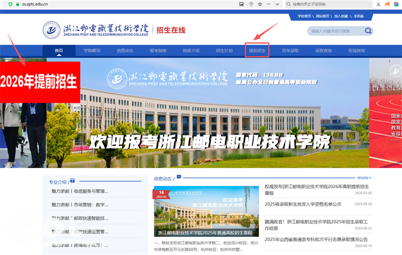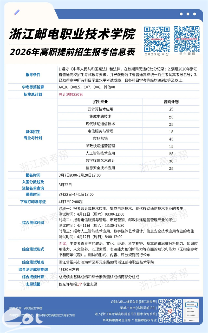 2026年高职提前招生报名正在进行中,你是否还在众多院校中徘徊不定?今天,就让浙江邮电职业技术学院来为你答疑,期待成为你的“心”选答案。(提招总计划230人,全部面向普高生!全省唯一聚焦前沿领域行业校,多个专业可选!)