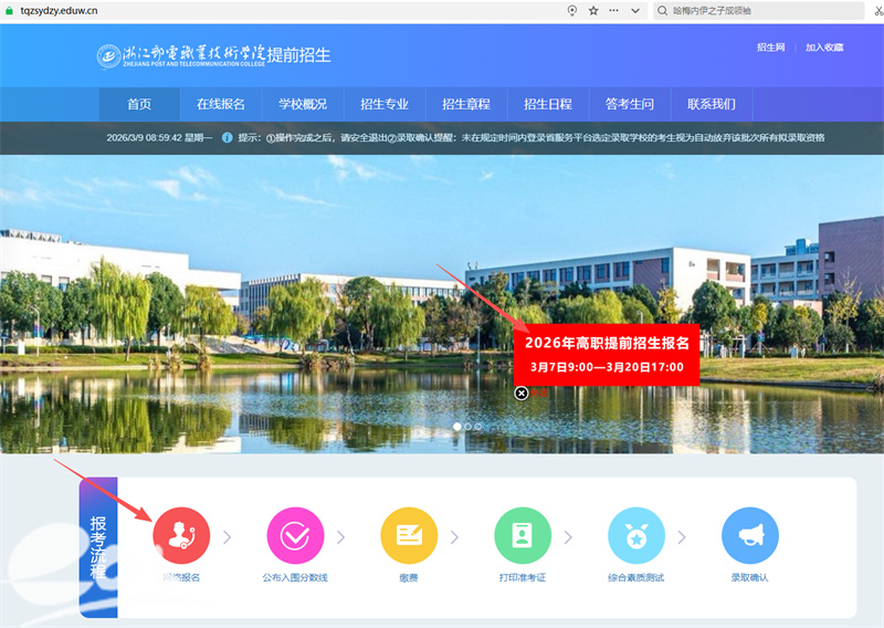答:凡符合该校高职提前招生报名条件的考生,须在3月7日9:00-3月20日17:00期间登录浙邮院招生在线网站(https://zs.zptc.edu.cn),根据提示进入浙江省教育考试院指定的“高职提前招生服务平台”进行网络报名,每位考生仅允许填报1个专业志愿。