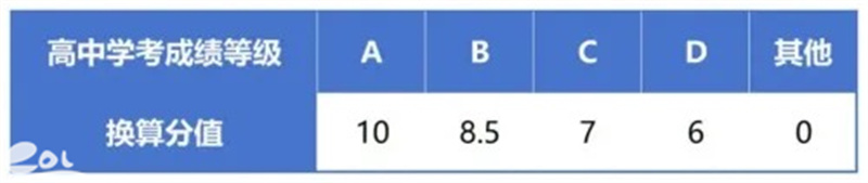 基础成绩根据考生语文、数学、外语、政治、物理、历史、化学、地理、生物学、技术等十门高中学业水平考试科目成绩等级换算生成,基础成绩为各科目学考等级对应分值的累加,满分100分。具体等级换算分值详见下表: