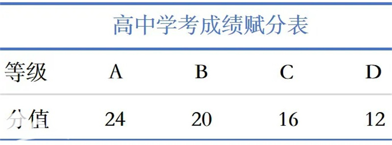 按照考生高中学业水平考试成绩,取其中5门进行折算,其中语文、数学必取,其余8门科目取最高3门折算。具体算法按下表将每门科目的等级转换为相应的分值,作为考生的高中学业水平考试综合成绩。总分120分。高中学考成绩按照下表转换为分值: