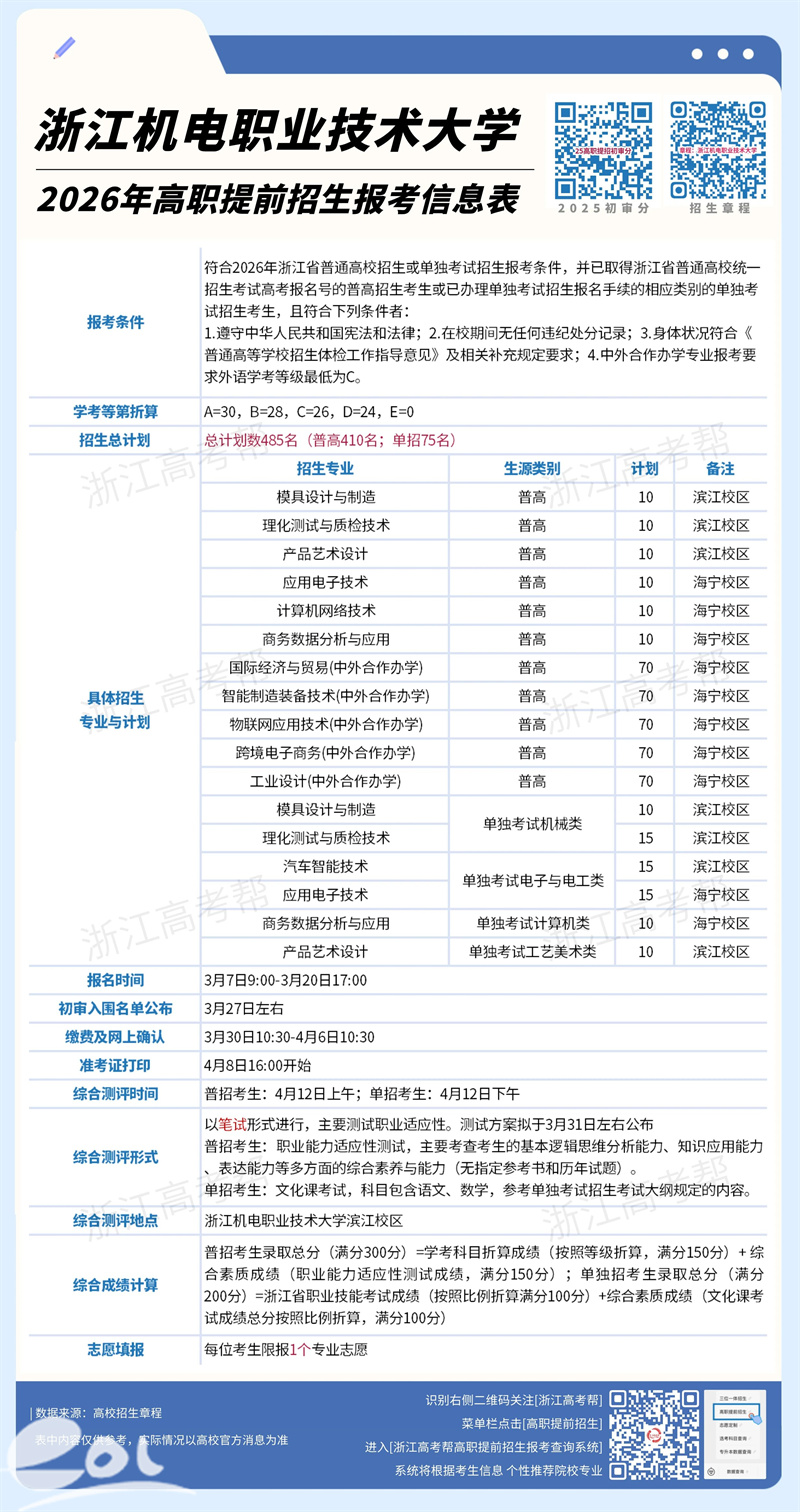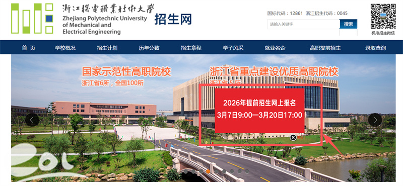 报名方式:登录浙江省教育考试院提前招生报名网站或浙江机电职业技术大学招生网(https://zs.zime.edu.cn/中提前招生相关栏目)完成网上注册,按要求准确完整地填写报名信息,并进行志愿填报,每位考生限报1个专业志愿。