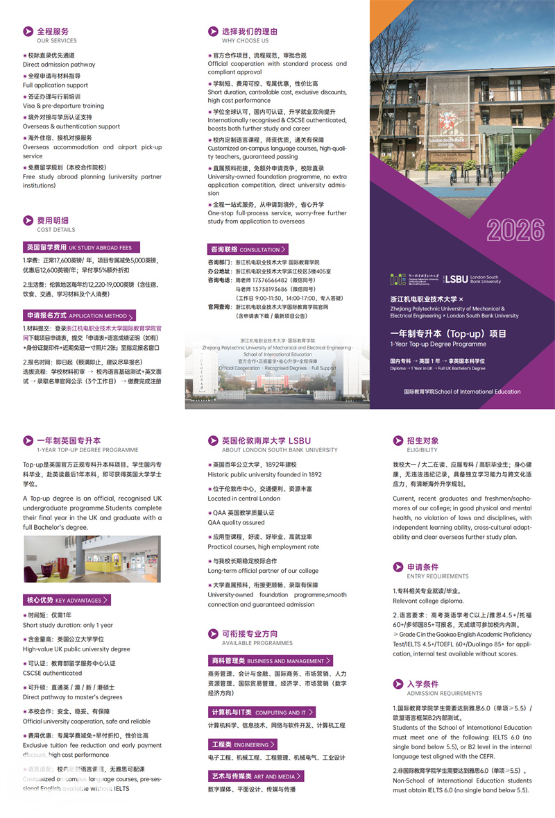 浙江机电职业技术大学学生在国内完成三年专科学习,雅思成绩达到 6.0,即可申请伦敦南岸大学 1 年制 Top-up本科课程,毕业后获得中英两国教育部均认可的英国学士学位。