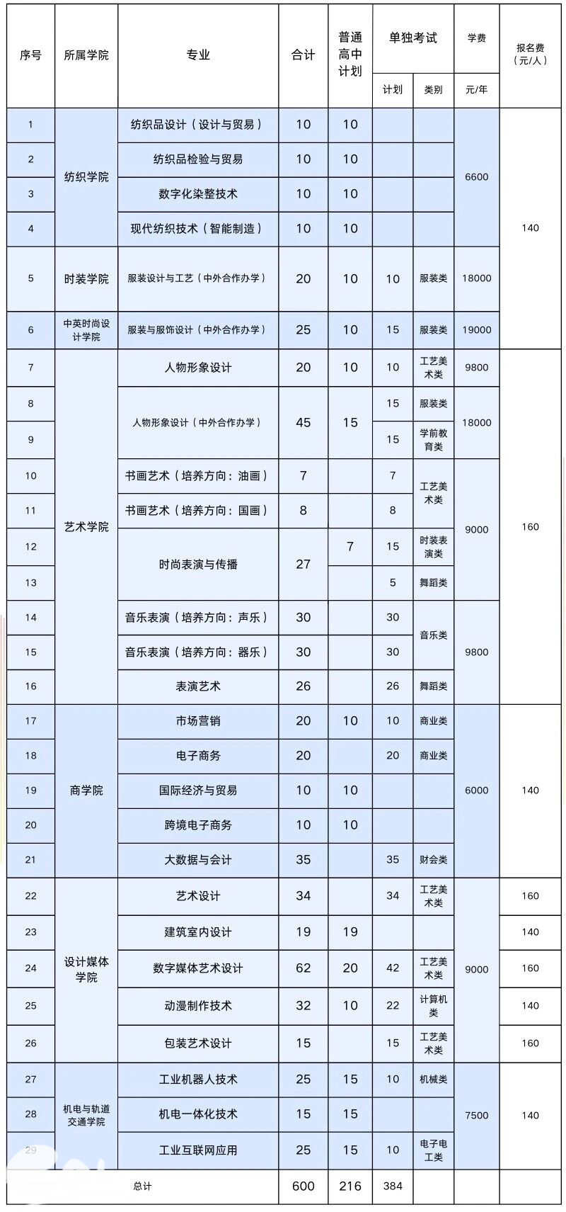 答:学校计划招生600人,其中普高招生计划216人,单独考试招生计划384人。
