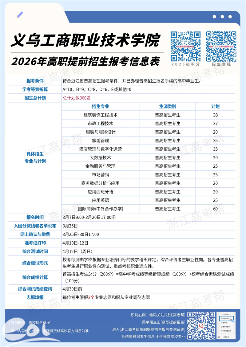 2026年高职提前招生报名正在进行中,你是否还在众多院校中徘徊不定?今天,就让义乌工商职业技术学院来为你答疑,期待成为你的“心”选答案。(面向普高生,可报3个专业!位于国际商贸名城的公办高职,提前招生计划360名!)
