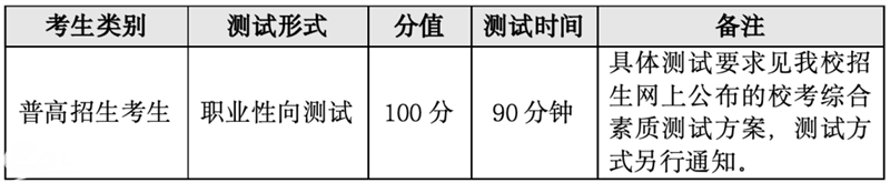 校考综合素质测试实行分类命题、分类评价。各专业普高招生考生进行职业性向测试,重点考核职业适应性。测试成绩四舍五入保留两位小数。