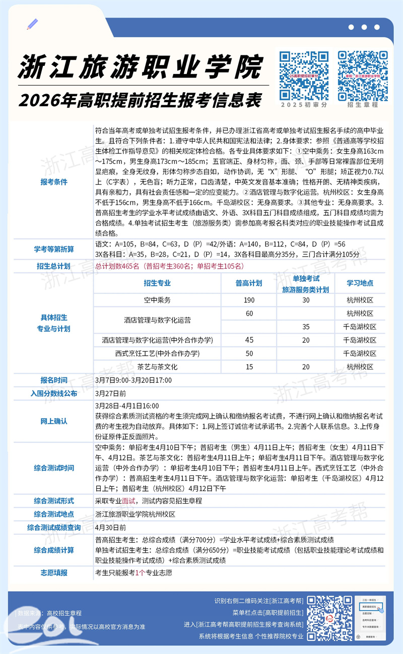 2026年高职提前招生报名正在进行中,你是否还在众多院校中徘徊不定?今天,就让浙江旅游职业学院来为你答疑期待成为你的“心”选答案。(旅游特色公办高职!提招计划465名,普高生、中职生均可报!语文外语学考成绩好有优势!)