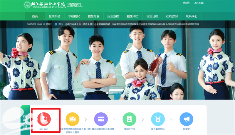 报名方式:登录学校招生信息网(https://zs.tourzj.edu.cn)进行网络报名,报名时按要求填写和提交相关信息,具体按报名须知要求完成报名工作。