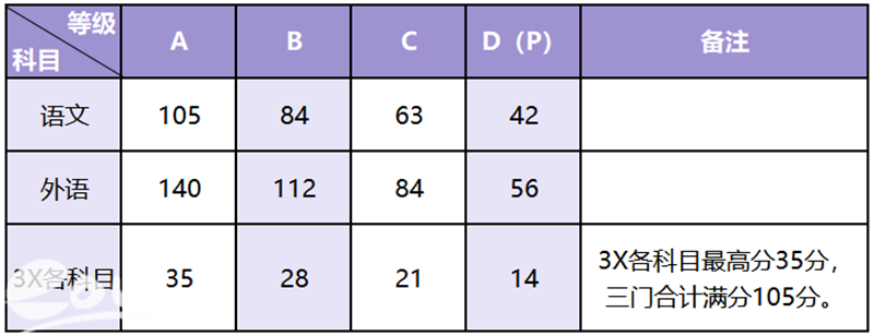 学业水平考试成绩由语文、外语、3X科目五门科目成绩组成,五门科目成绩均需为合格成绩。3X科目是在除语文、外语之外学业水平考试科目中选择的三门最优等级科目。折算方法如下: