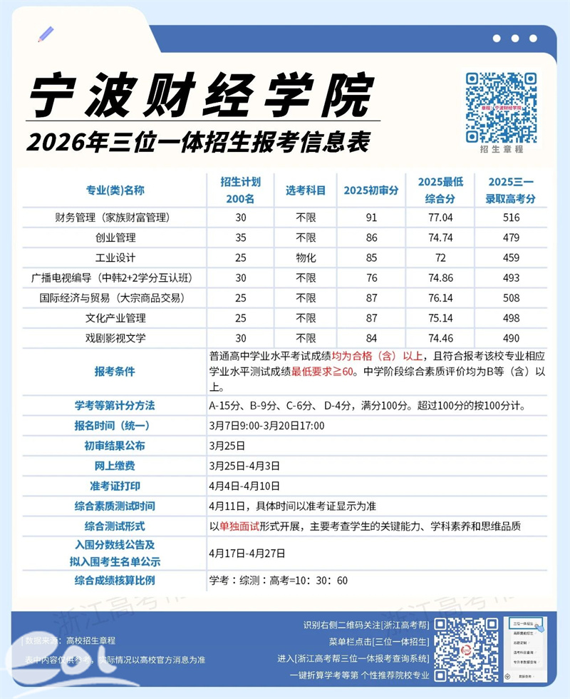 2026年三位一体招生报名正在进行中,你是否还在众多院校中徘徊不定?今天,就让宁波财经学院来为你答疑,期待成为你的“心”选答案。(初审、综测入围比例提高1倍!宁波财经学院三位一体招生200人,7个专业可选!)