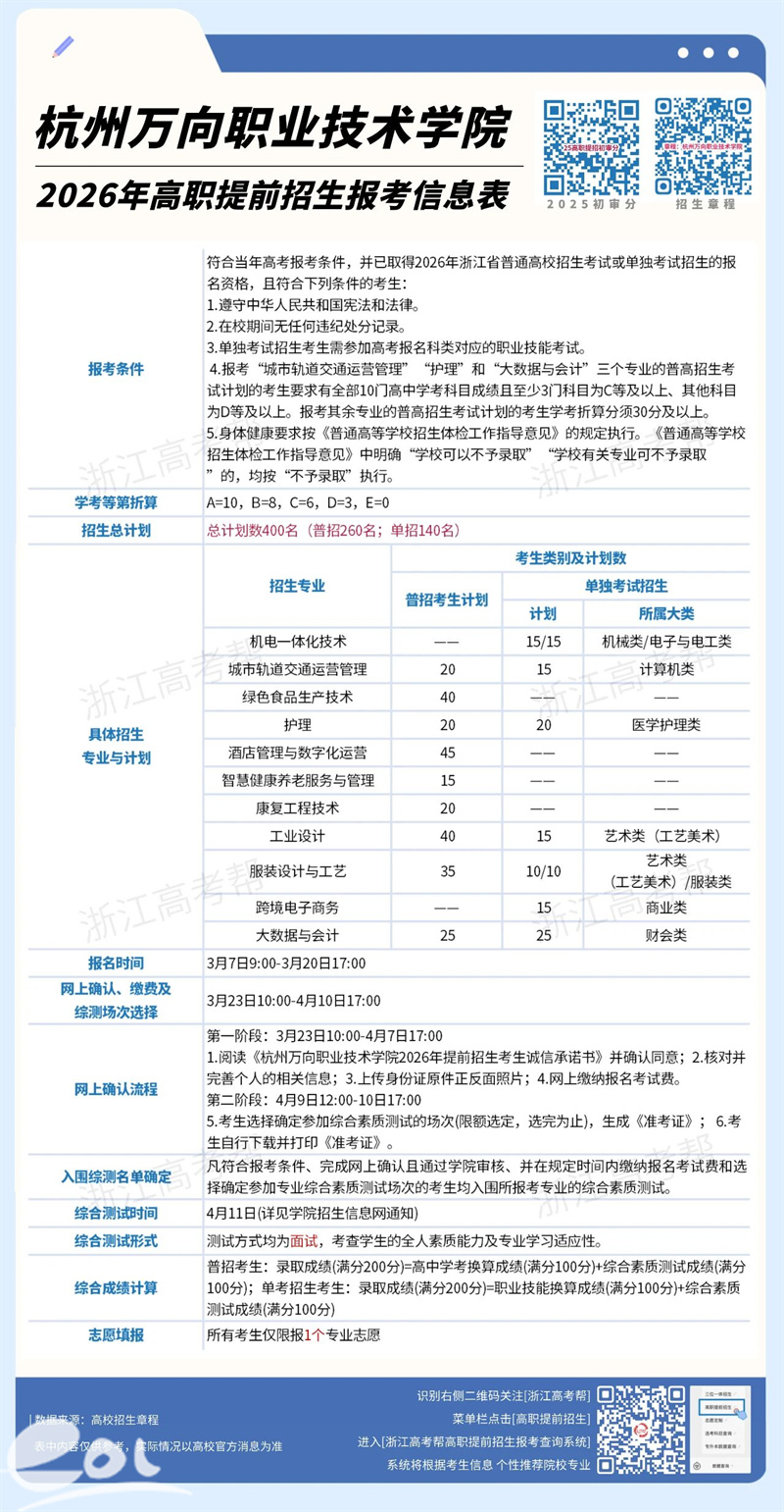 2026年高职提前招生报名正在进行中,你是否还在众多院校中徘徊不定?今天,就让杭州万向职业技术学院来为你答疑,期待成为你的“心”选答案。(地处杭州,创业率高!提前招生计划400名,入围比例高,普高生和中职生可报!)