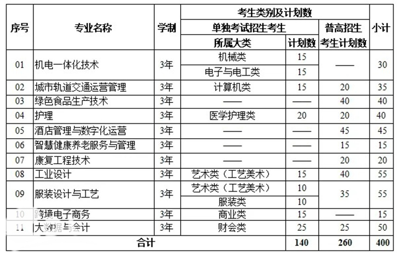 答:2026年,学校高职提前招生计划为400名,跟去年持平,招收普高招生考生和单独考试招生考生。每位考生只能报考1个专业志愿。具体招生计划如下: