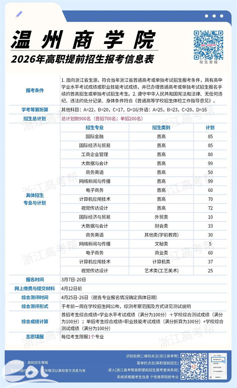 答:2026年,温州商学院高职提前招生面向普高、单考单招总计划招生900人,其中普高生源计划增加100名,招生专业略有调整。