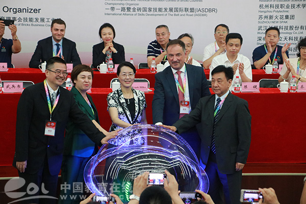 中国教育在线浙江站讯 (编辑 陈显婷 通讯员 戴雯)7月11日上午,2018一带一路暨金砖国家技能发展与技术创新大赛之首届模具数字化设计与智能制造技能大赛中国赛区决赛在杭州科技职业技术学院开幕。亚洲模具协会联合会主席(FADMA)、中国模具工业协会会长武兵书,德国道依茨集团董事长Dr.Frank Hiller、亚洲区首席执行官Mr.Christian Zürnstein,杭州市人民政府副市长陈红英、副秘书长杨建华,杭州市委组织部副部长、人才办常务副主任陈键,中国模具工业协会秘书长秦珂,一带一路暨金砖国家技能发展国际联盟副理事长刘辉,奥地利华人总会秘书长马建,金砖国家工商理事会技能组执行总监崔雪艳,杭州科技职业技术学院党委书记谢列卫、院长许淑燕等领导、嘉宾出席开幕式。来自14个国家的代表队、相关企业代表共300余人参加开幕式。开幕式由杭州科技职业技术学院院长许淑燕、金砖国家工商理事会技能组执行总监崔雪艳主持。